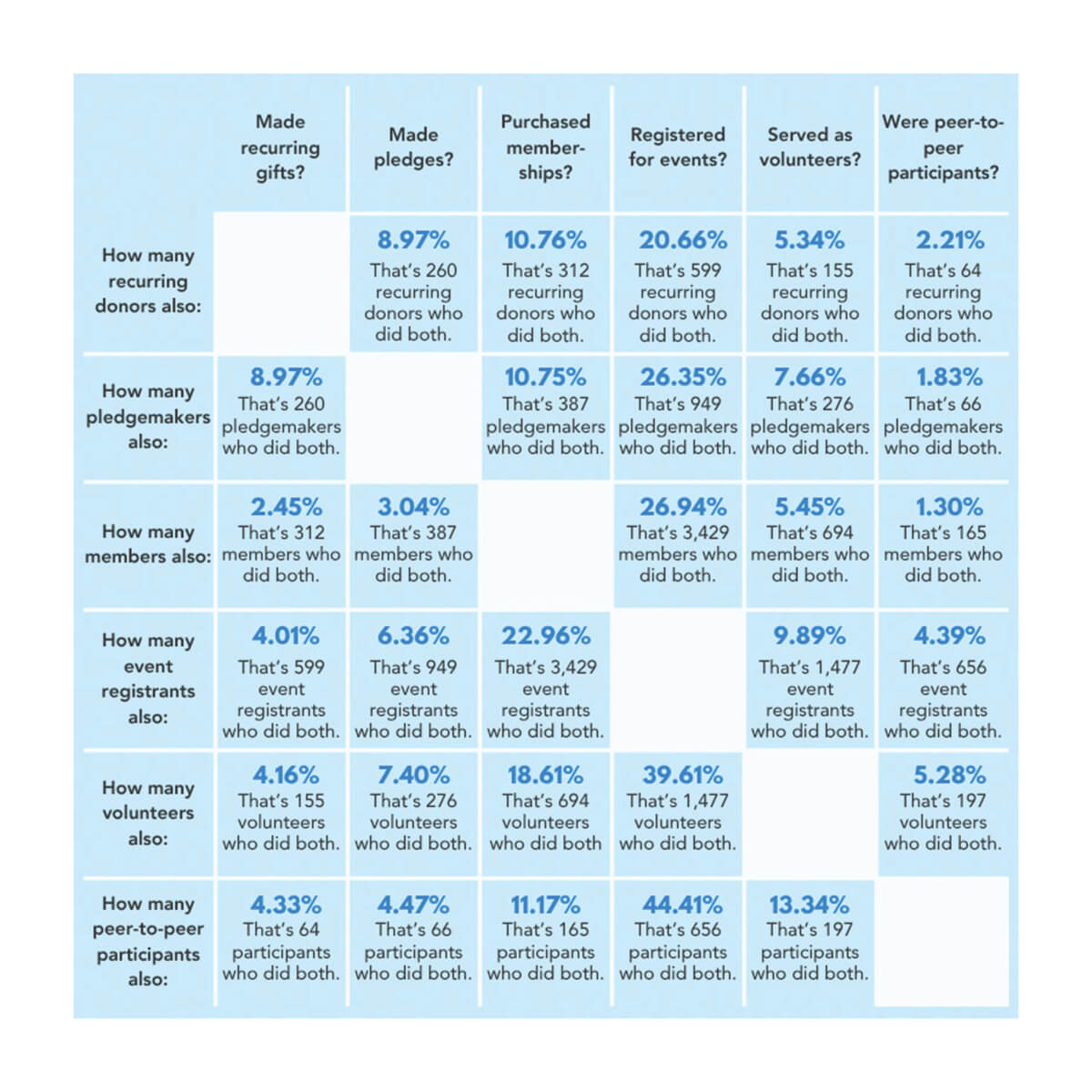 When we analyzed five years of donor behavior, we included their one-time gifts, recurring donations and pledges. But we looked beyond their transactional history, too. Our data set also included their volunteer history, event registrations, peer-to-peer activity participation and nonprofit memberships.